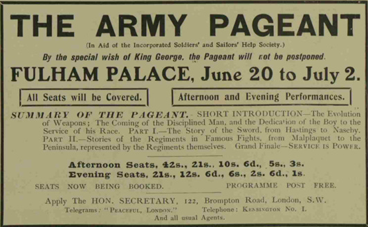 The Army Pageant staged during the summer of 1910 in the grounds of Fulham Palace, London was by all accounts quite a spectacle.